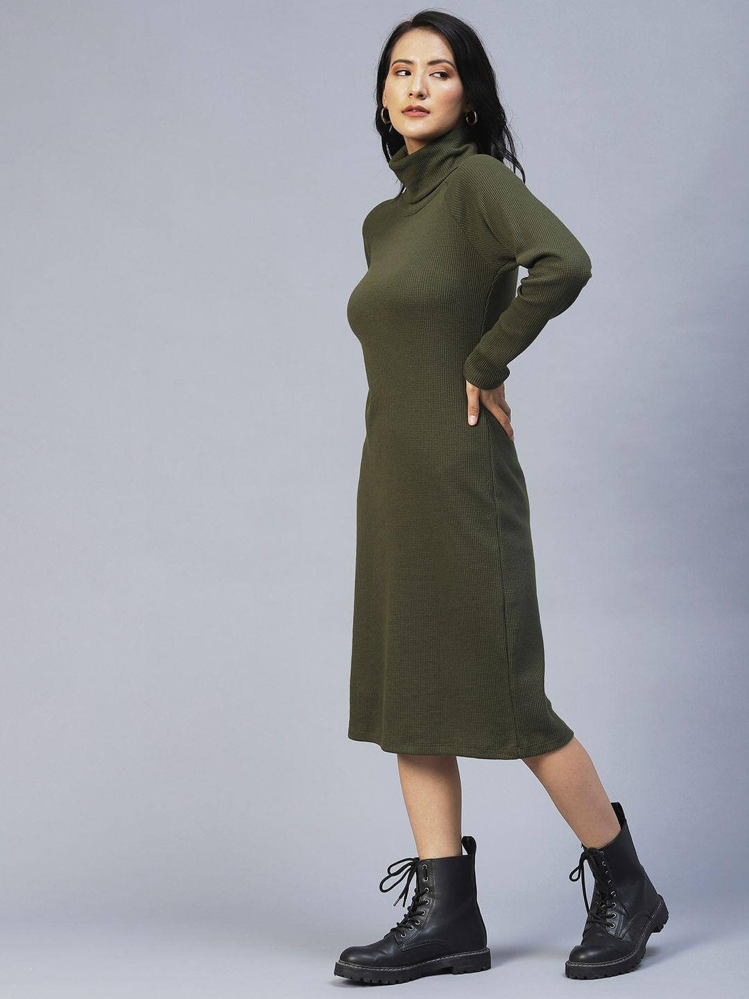 Rigo Women's Olive Green Turtle Neck Waffle Knit Cotton Midi Dress